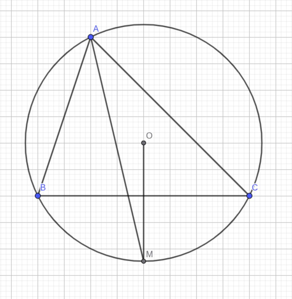 cho tam giác ABC có 3 điểm A, B, C thuộc đường tròn tâm O.Kẻ tia phân giác góc A cắt đường tròn tại M.Chứng minh
