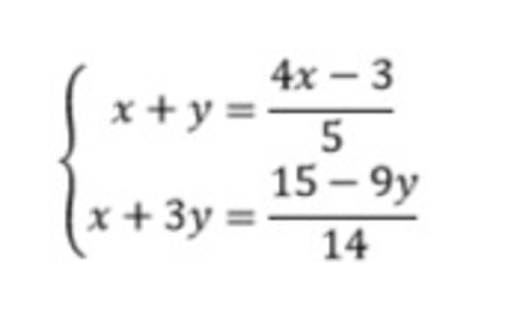 $\begin{cases} x+y=\dfrac{4x-3}{5}\\x+3y=\dfrac{15-9y}{14}\\ \end{cases}$