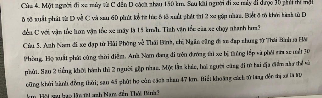 Câu 4. Một người đi xe máy từ C đến D cách nhau 150 km. Sau khi người đi xe máy đi được 30 phút thì một