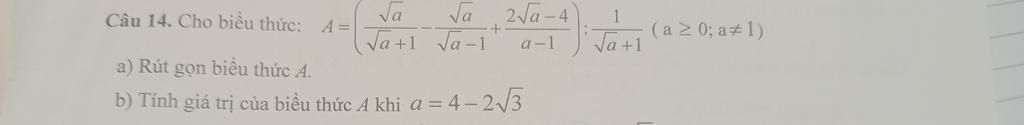$a)$ `A=((\sqrt{a})/(\sqrt{a}+1)-(\sqrt{a})/(\sqrt{a}-1)+(2\sqrt{a}-4)/(a-1)):(1)/(\sqrt{a}+1) (0<=a!=1)`