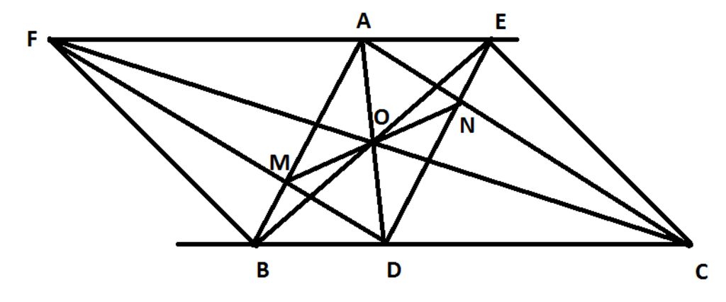 DF ∥ AC (E, F ∈ xy). Gọi M là giao điểm của AB và DF. Gọi N là giao điểm của AC và DE. Gọi O là giao điểm của DA và CF. Chứng minh rằng