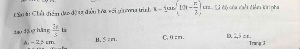 Li độ: `x=5cos(10*[7pi]/60-[pi]/2)=-2.5cm`