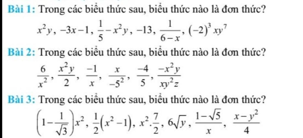 `(6/x^2;-1/x;(-x^2y)/(xy^2z)` không phải đơn thức vì có biến ở mẫu)