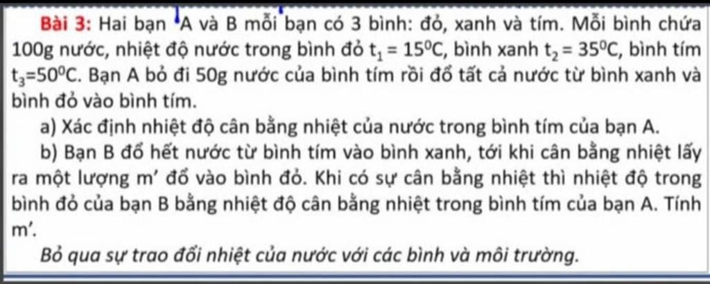 Lượng nước còn lại trong bình tím của A: $m'_{3} = 100 - 50 = 50g$.