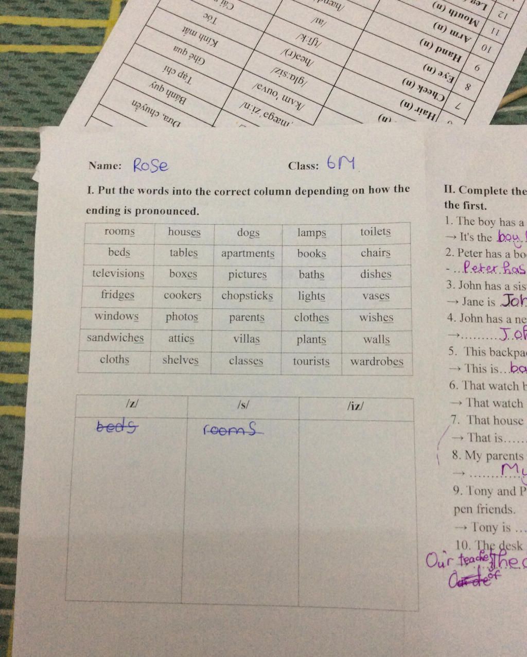 `-` /z/: rooms, dogs, beds, tables, chairs, televisions, pictures, cookers, windows, photos, clothes, villas, walls, wardrobes