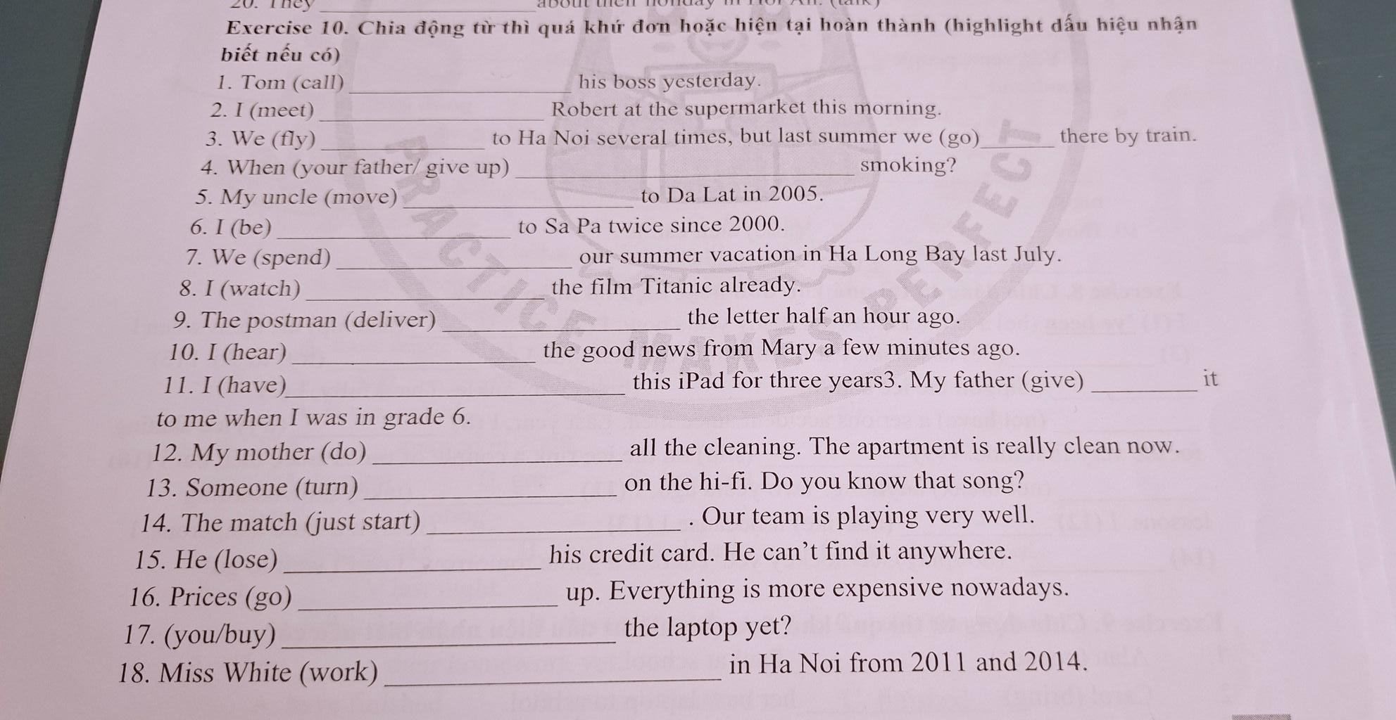 →ko có t/gian cụ thể ↔ câu cuối là kết quả hiện tại của hành động trong qk