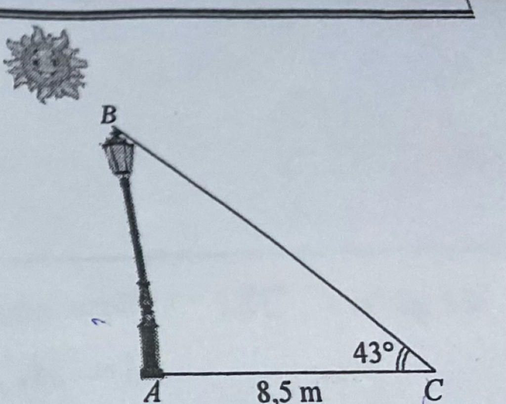Một cột đèn vuông góc với mặt đất có bóng trên đó dài 8,5m . Các tia nắng tạo với mặt đất một góc bằng 43 độ . Chiều cao của cột đèn là: