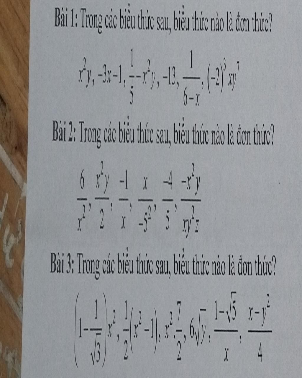 Trong các biểu thức trên, biểu thức là đơn thức gồm :