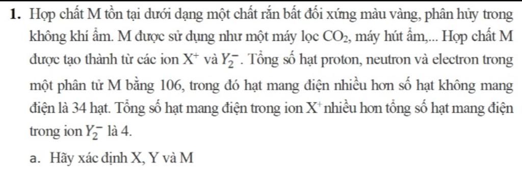 Số hạt mang điện trong `X^+` nhiều hơn `Y_2^-` là 4