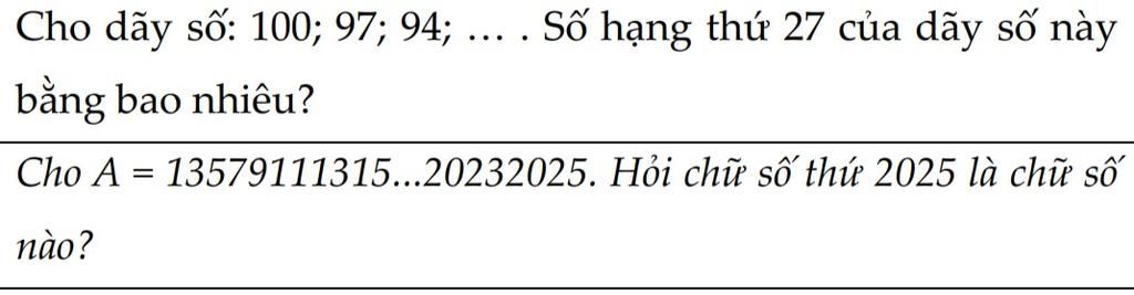 Số hạng thứ `27` của dãy số `100; 97; 94; ...` là: