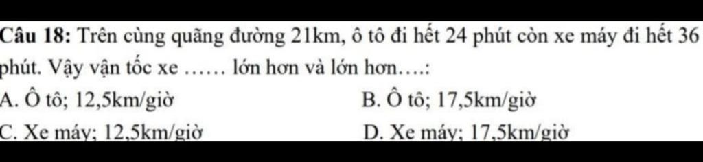 Vì `52,5 - 35 = 17,5 (km/h)` Nên vận tốc xe ô tô lớn hơn vân tốc xe máy `17,5` km/h