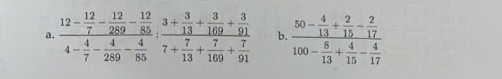 `(12-12/7-12/289-12/85)/(4-4/6-4/289-4/85) : (3+3/13+3/169+3/91)/(7+7/13+7/169+7/91)`