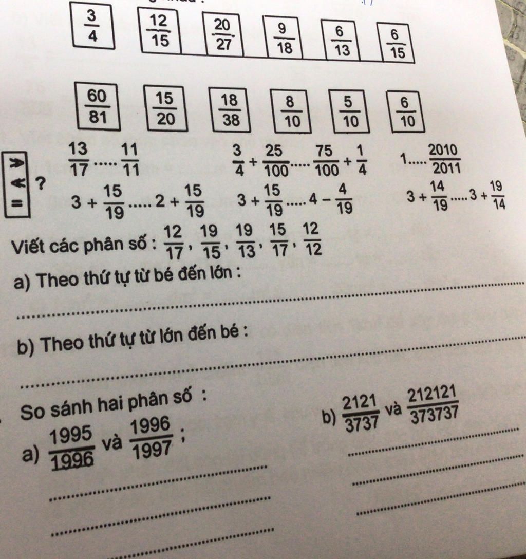 Do đó: `12/17< 15/17< 12/12<19/15 < 19/13 `