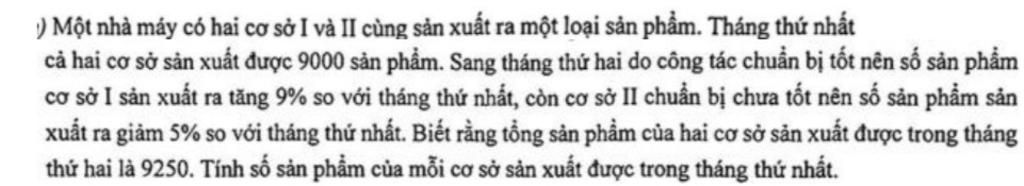 Gọi số sản phẩm của cơ sở `I` và `II` trong tháng thứ nhất lần lượt là: `x;y` (sản phẩm) `(9000 > x;y > 0;x,y \in NN)`