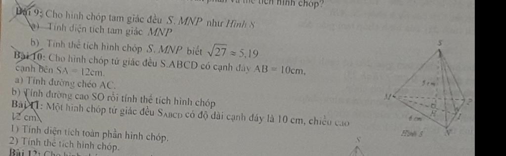 $\Rightarrow V_{S.MNP} =\dfrac{1}{3} SH \cdot S_{\triangle MNP} = \dfrac{1}{3} \cdot 5 \cdot 3\sqrt{27} \approx = 25,95(cm^3)$