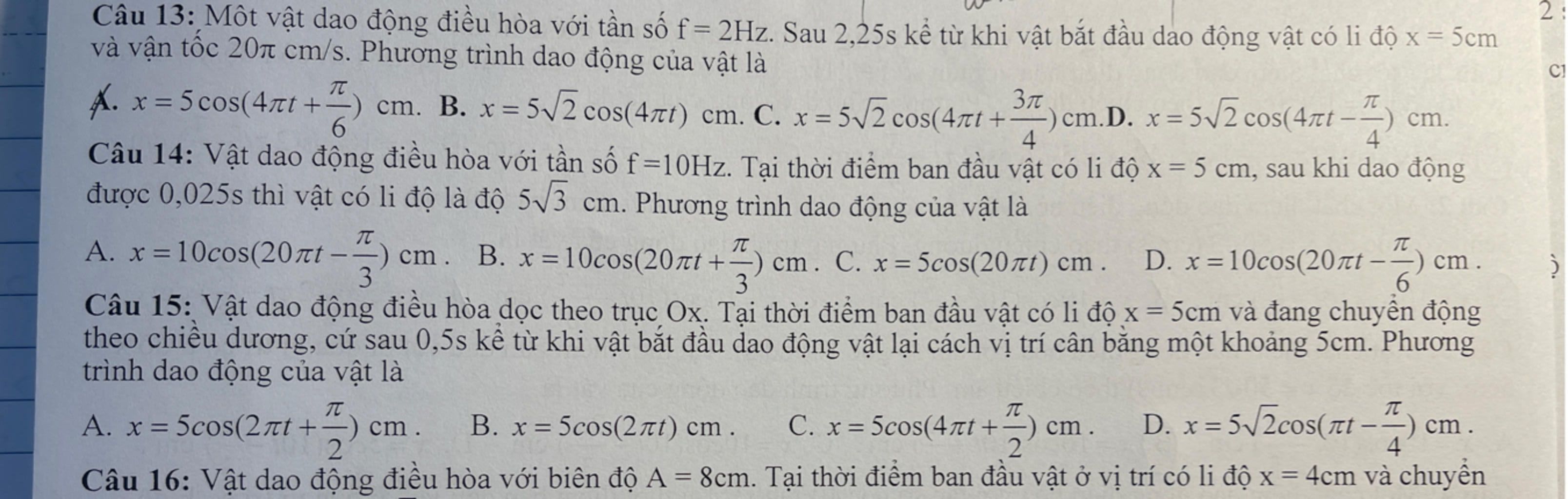 Phương trình dao động: `x=5sqrt2 cos(4pit+[3pi]/4)`