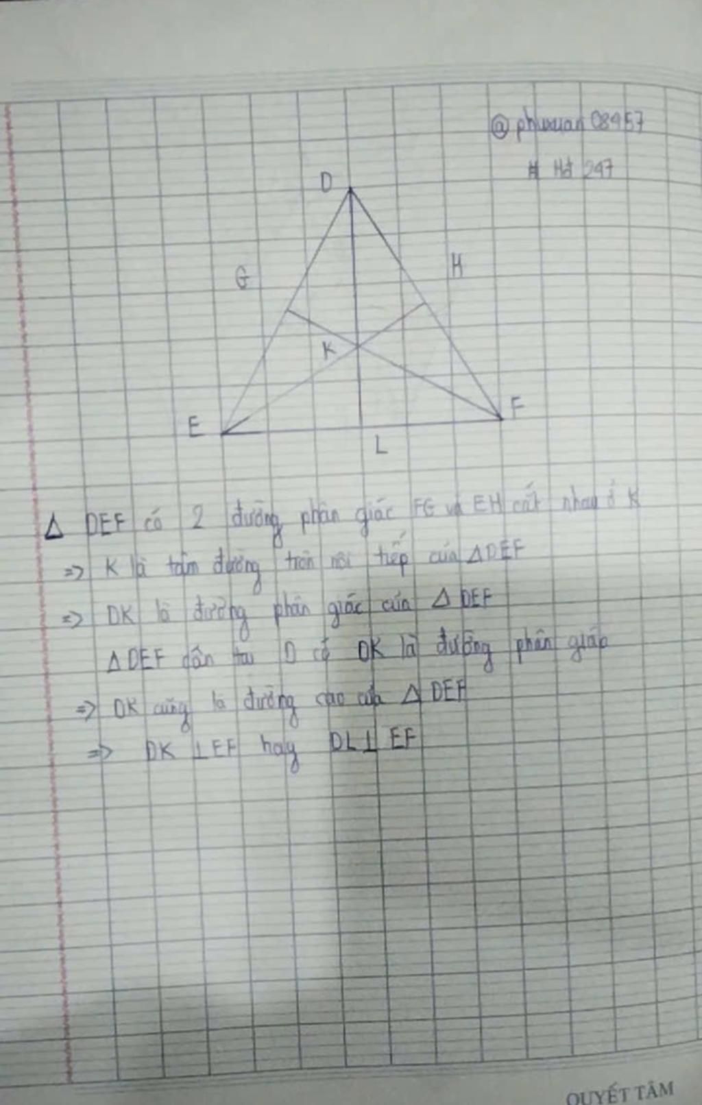 Bài 6: Cho △DEF cân ở D có hai đường phân giác FG và EH cắt nhau ở K. DK cắt EF ở L.Chứng minh DL vuông góc với EF