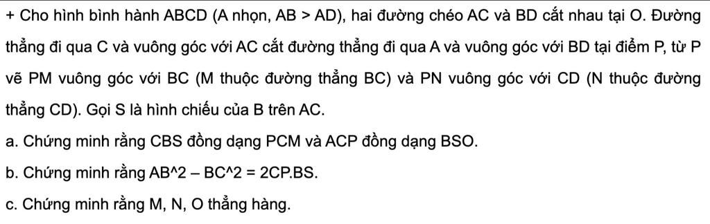 + Cho hình bình hành ABCD (A nhọn, AB > AD), hai đường chéo AC và BD cắt nhau tại O. Đường