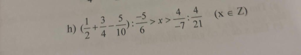 ` ( 1/2 + 3/4 - 5/10 ) : (-5)/6 > x > 4/(- 7) : 4/21 ` ( `x ∈ ZZ` )