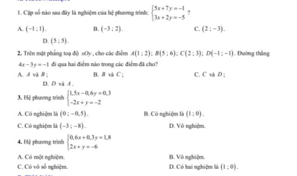 1. Cặp số nào sau đây là nghiệm của hệ phương trình: