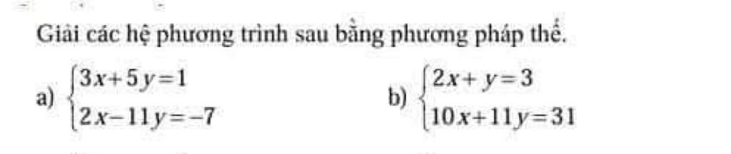 Thay `x=(1-5y)/3` vào `2x-11y=-7`, ta có: