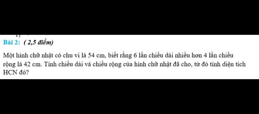 Vậy chiều dài hình chữ nhật là `15cm`, chiều rộng hình chữ nhật là `12cm`