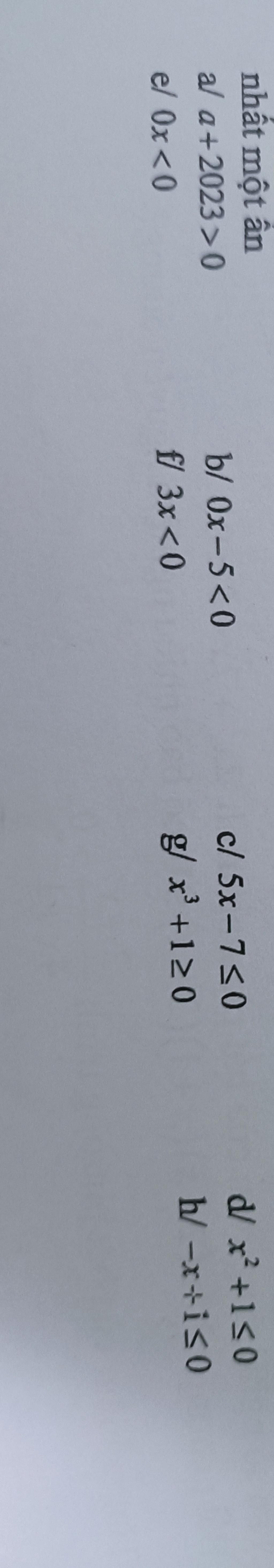 câu `h` đề bài bị mờ đoạn số `1` nên mình tưởng là chữ `i` nhé. Bạn sửa đề câu `h` giúp mình là `-x+1 <= 0` `->` Nhận.