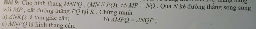 $\widehat{MPQ}=\widehat{NKQ}=\widehat{NQK}=\widehat{NQP}$ vì $MP//NK, \Delta NKQ$ cân tại $N$