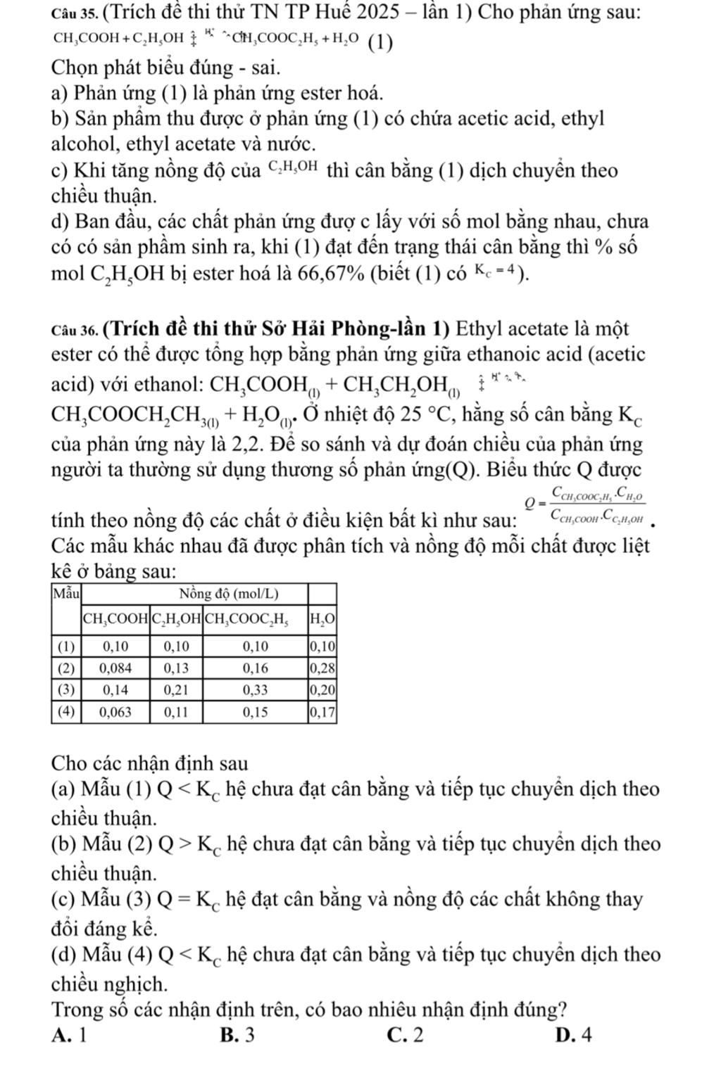 `c)` Đúng, khi tăng nồng độ `C_2H_5OH,` cb chuyển dịch theo chiều giảm `C_2H_5OH` là chiều thuận.