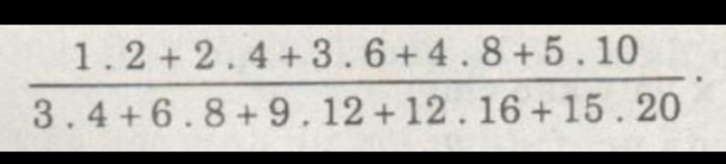 `(1 . 2 + 2 . 4 + 3 . 6 + 4 . 8 + 5 . 10)/(3 . 4 + 6 . 8 + 9. 12 + 12 . 16 + 15. 20)`