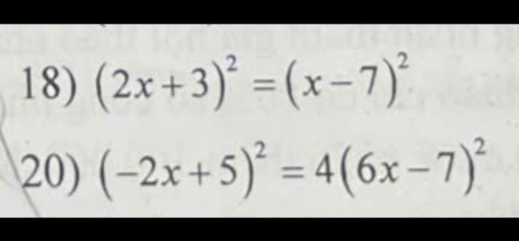 `18) (2x + 3)^2 = (x - 7)^2`