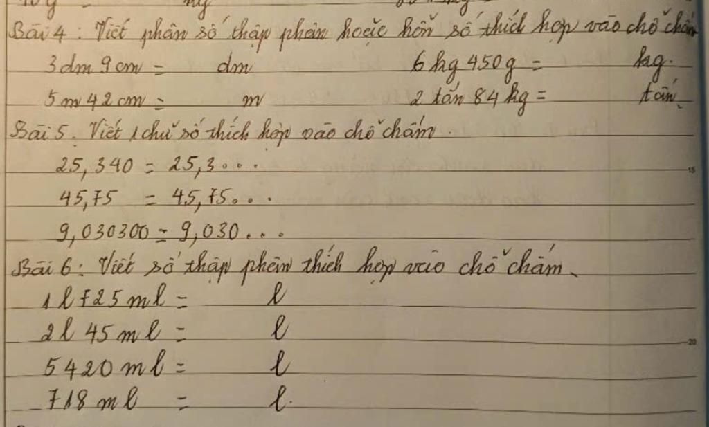 `5m42cm=` $5$`42/100m` `2` tấn `84kg =` $2$`84/1000kg`