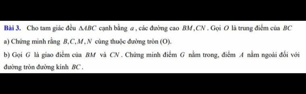 Bài 3. Cho tam giác đều ABC cạnh bằng a , các đường cao BM,CN . Gọi O là trung điểm của BC
