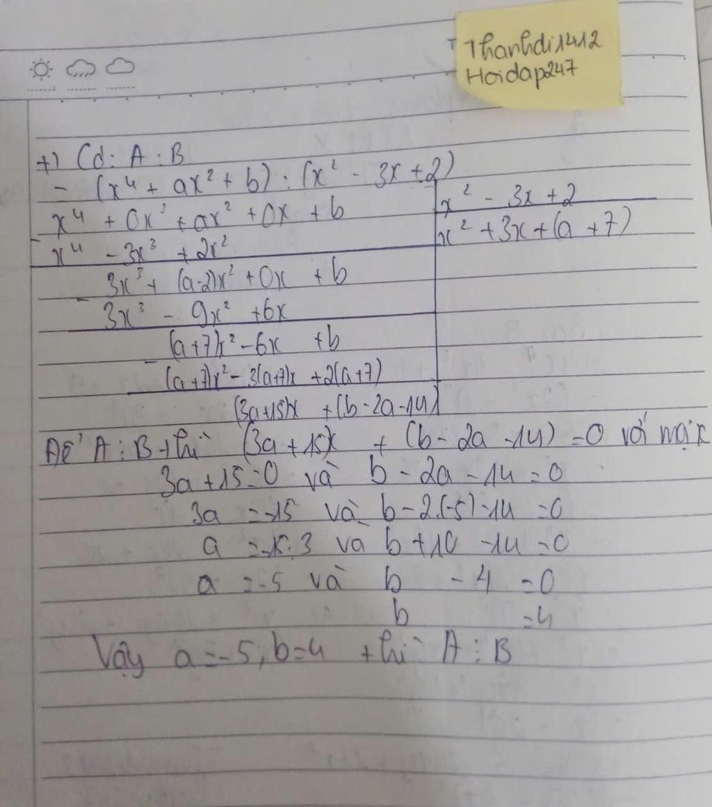 Cho đa thức `A=x^4 +ax^2 +b` . Hãy xác định hệ số `a;b` của đa thức `A` biết `A` chia hết cho đa thức `B=x^2 -3x+2`