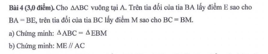 $\textbf{b$\bigg)$}$ Ta có: $\triangle ABC = \triangle EBM (cmt)$