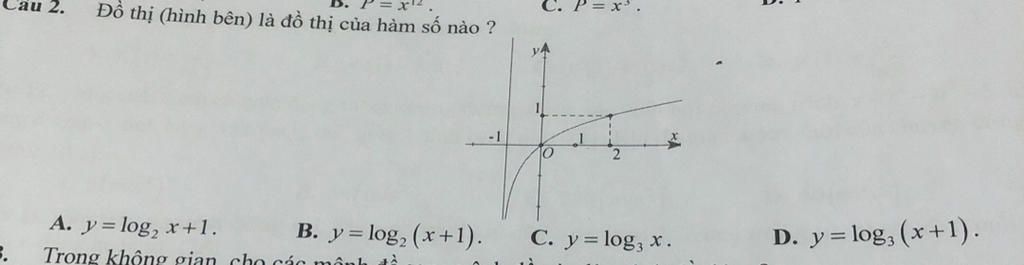 $\Rightarrow$ Loại các đáp án $\log_2 x + 1$ và $\log_3 x$ vì $\log_a x (a > 0, a \ne 1)$ chỉ xác định khi $x > 0$