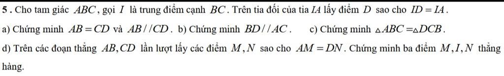 5 . Cho tam giác ABC, gọi I là trung điểm cạnh BC. Trên tia đối của tia LA lấy điểm D sao cho ID=IA.