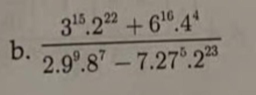 `( 3^15 . 2^22 + 6^16 . 4^4 )/( 2 . 9^9 . 8^7 - 7 . 27^5 . 2^23 )`