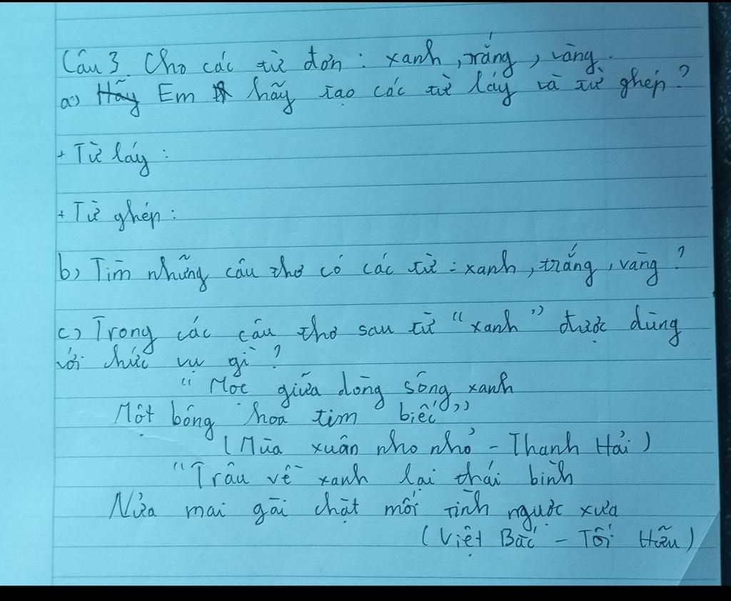 `b)` Những câu thơ có các từ: xanh, trắng, vàng