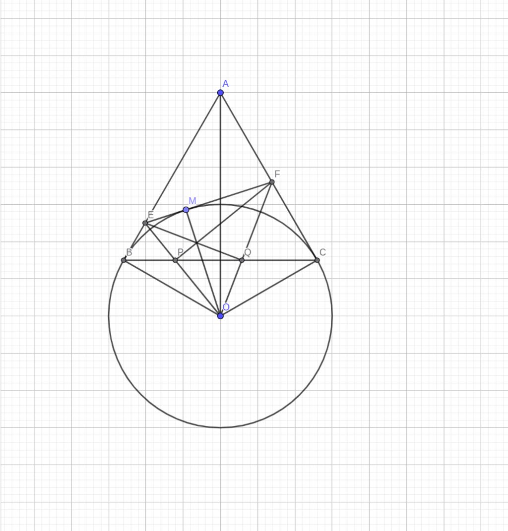 a) Gọi M là một điểm trên cung BC nhỏ .Tiếp tuyến tại M của đường tròn (o) lần lượt cắt AB,AC tại E và F; đường thẳng BC lần lượt cắt OE,OF tại P VÀ Q . Chứng minh rằng góc EOF = 60 độ và tứ giác OBEQ nội tiếp
