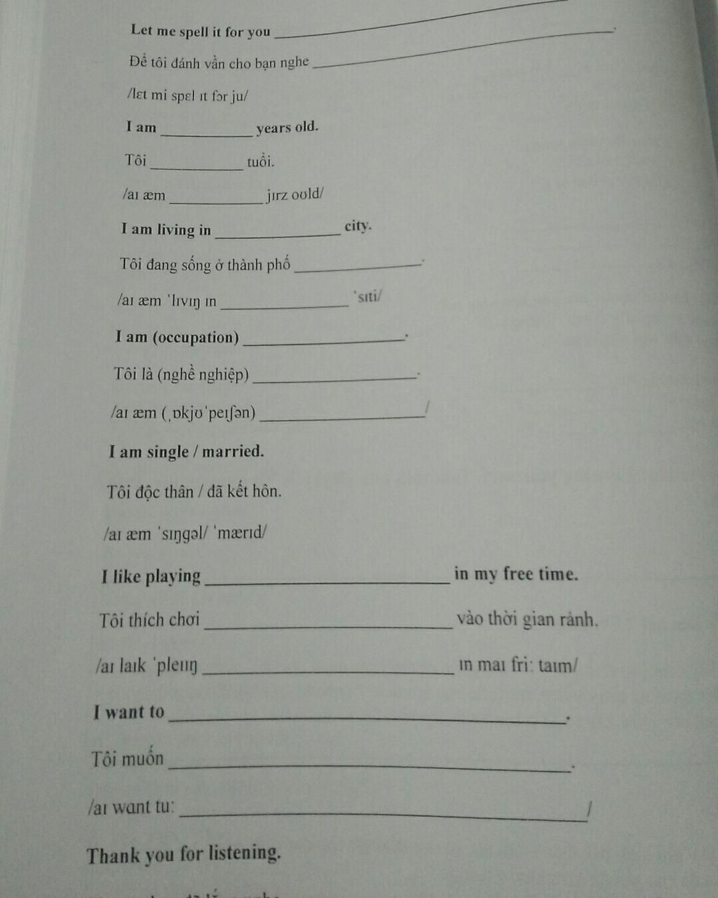 4I am (occupation) _______. (Tôi là (nghề nghiệp) _______.)