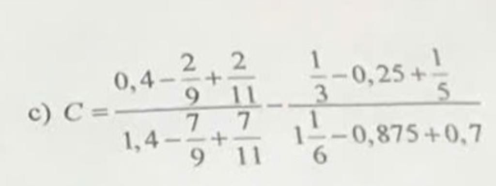 c) `C = (0,4 - 2/9 + 2/11)/(1,4 - 7/9 + 7/11) - (1/3 - 0,25 + 1/5)/(1 1/6 - 0,875 + 0,7)`