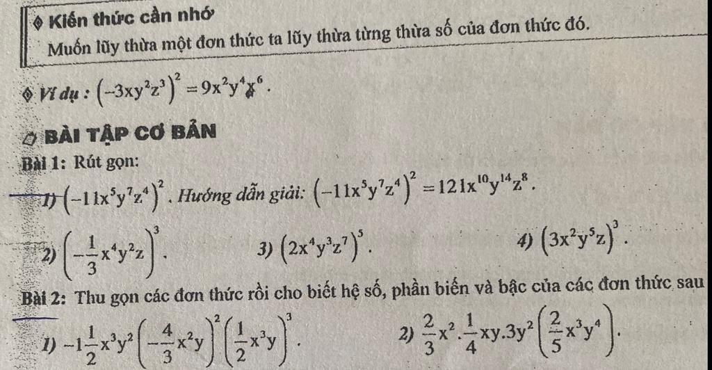 `2)` `(-1/3 x^4y^2z)^3 = (-1/3)^3 (x^4)^3 (y^2)^3 z^3 = -1/27 x^12y^6z^3`