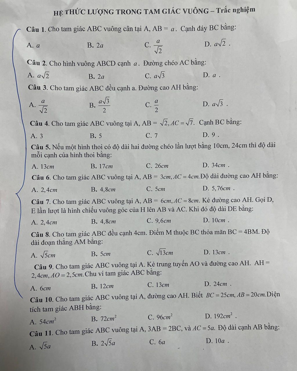 Câu 1. Cho tam giác ABC vuông cân tại A, AB= a. Cạnh đáy BC bằng: