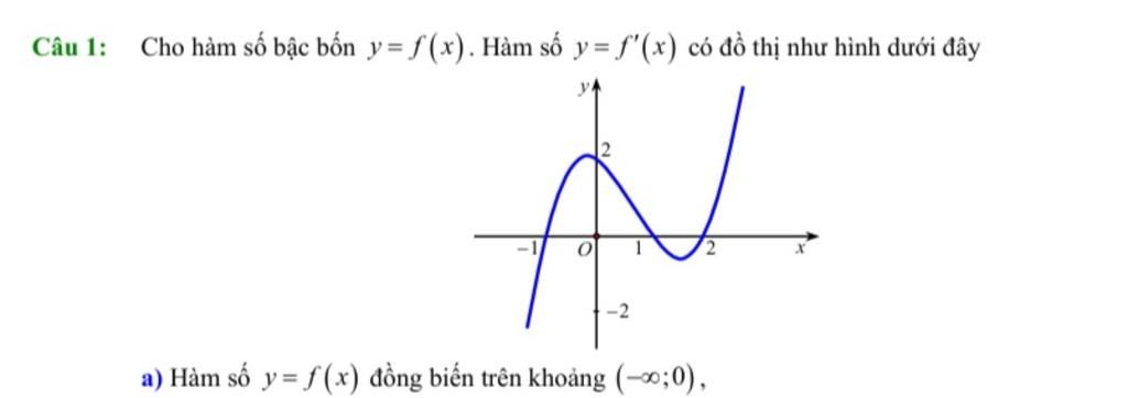 $\text{a$\bigg)$}$ Quan sát đồ thị $f'(x)$, ta thấy $f'(x) > 0$ trên khoảng $(-1; 0)$ và $f'(x) < 0$ trên khoảng $(-\infty; -1)$