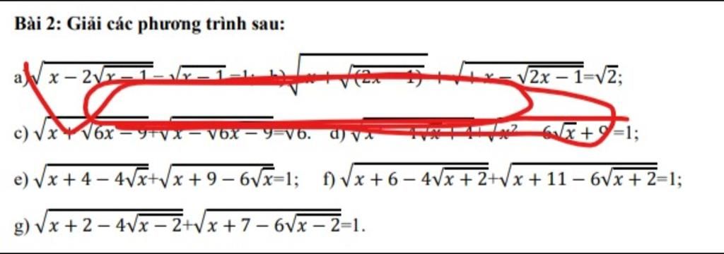 `e, \sqrt{x + 4 - 4\sqrt{x} + \sqrt{x + 9 - 6\sqrt{x}} = 1` (ĐK:`x \ge 0`)