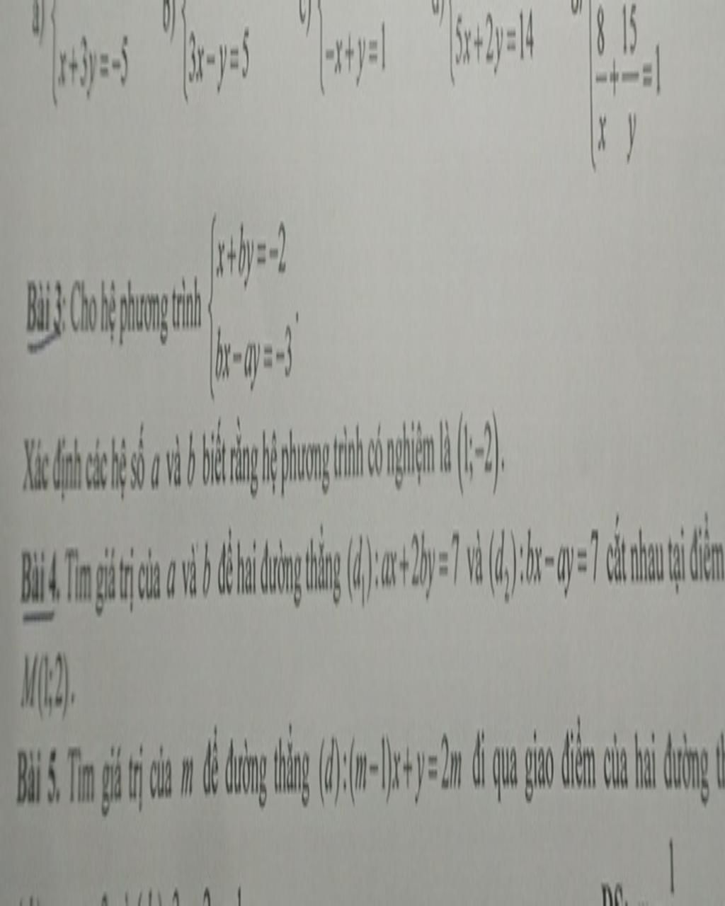 Vậy với `a=-7/3 ; b=7/3` thì `(d_1):ax+2by=7` và `(d_2): bx-ay=7` cắt nhau tại điểm `M(1;2).`