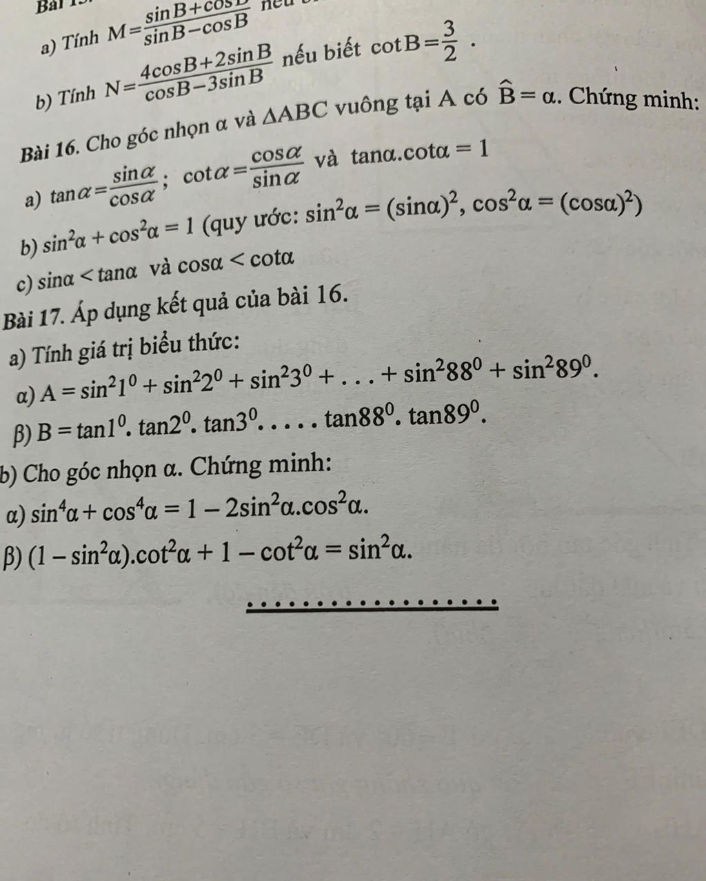 Ta có: `B = \underbrace{tan1^o . tan2^o . tan3^o . ... . tan88^o . tan89^o}_{\text(89 hạng tử)}`