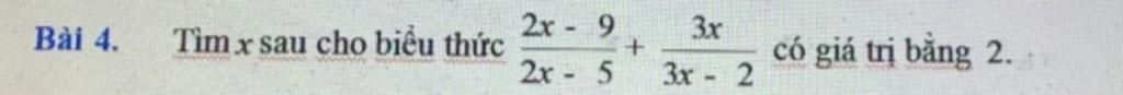 `( 2x - 9 )/( 2x - 5 ) + ( 3x )/( 3x - 2 ) = 2` ĐKXĐ `x \ne 5/2 ; 2/3`