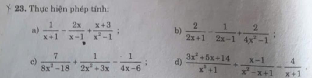 $=\dfrac{3x^2+5x+14}{\left(x+1\right)\left(x^2-x+1\right)}+\dfrac{\left(x-1\right)\left(x+1\right)}{\left(x+1\right)\left(x^2-x+1\right)}-\dfrac{4\left(x^2-x+1\right)}{\left(x+1\right)\left(x^2-x+1\right)}$